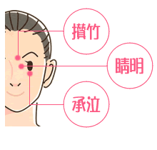 攅竹は眉頭の下に、承泣は眼の下縁の中央に、そして睛明は目頭の先端付近にそれぞれあります。