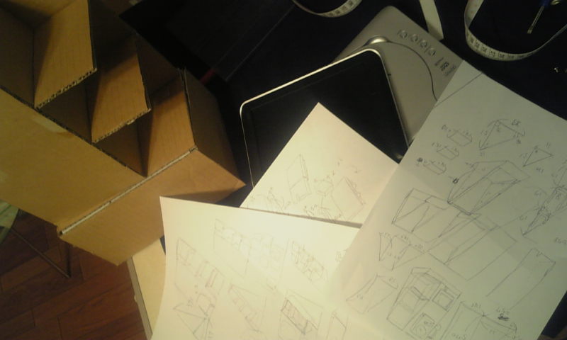 画像は設計図と無惨に解体されたDVDプレーヤー、そして段ボールで造った2/1スケールのCD什器。